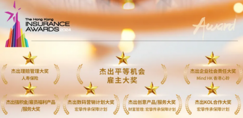 宏利的市场竞争力不仅体现在数据,也源于多方认可。在「香港保险业大奖2024」中,宏利获得了1项杰出大奖以及6项年度三强在内的7项大奖;于《彭博商业周刊/中文版》「金融机构大奖2024」中荣获十项殊荣;以及《理柏基金香港年奖2024》、《2024强积金大奖》等诸多奖项。