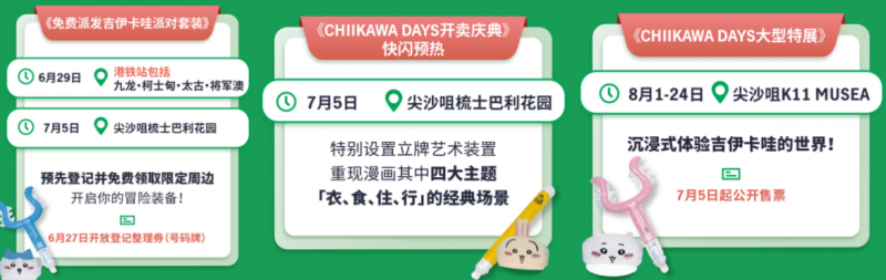 第三站:8月1日至8月24日,在尖沙咀K11 MUSEA将会开始《CHIIKAWA DAYS大型特展》,届时所有热爱chiikawa的朋友都可以沉浸式体验吉伊卡哇的世界!
